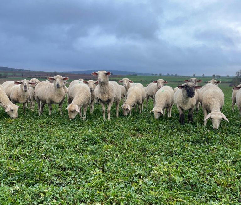 Seit November haben wir Besuch von einem Wanderschäfer und seinen Schafen bekommen. Die Schafe weiden, wandernd unsere Kleegrasflächen und die Zwischenfrüchte ab. Auf den Kleegrasflächen sorgt die Beweidung dafür, dass der Aufwuchs niedrig in den Winter geht und bei Schneefall nicht so anfällig für Schneeschimmel ist. Außerdem werden die Mäuse gestört, welche ebenfalls, bei vermehrtem Aufkommen, für lückige Bestände sorgen können.